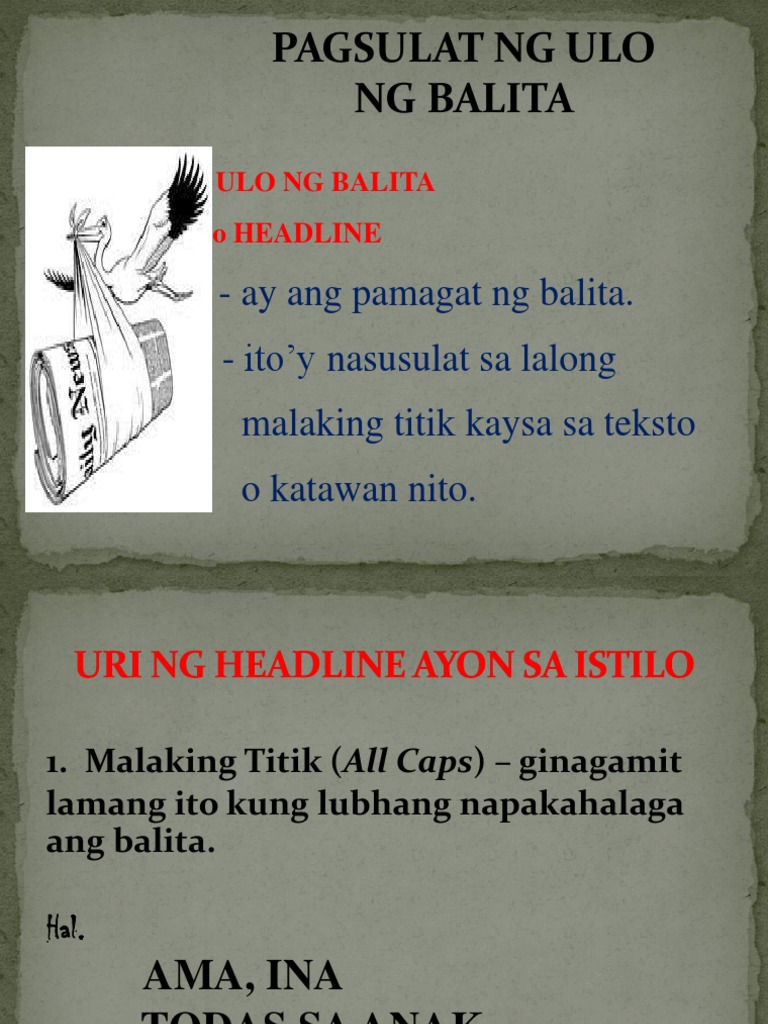 20112016 PAGSULAT NG ULO NG BALITA Ulo ng Balita o Headline ang pamagat ng isang balita na makikilala sa pamamagitan ng paggamit ng higit na malalaking titik kaysa sa nilalaman 36. PAGSULAT NG ULO NG BALITA RENE BENDAL SUNDAY 7 JANUARY 2018 Katuturan ng Ulo ng Balita Ang ulo ng balita ay ang pamagat ng isang balita na nagtataglay ng lalong malaking titik kaysa teksto o katawan nito. Pamamaraan sa Pagsulat ng Ulo Pagkatapos makabuo ng ideya para sa ulo ng balita ang kasunod na hakbang na gagawin ng editor ng kopya kung paano ito pagkasyahin sa nakalaang espasyo sa pahina.