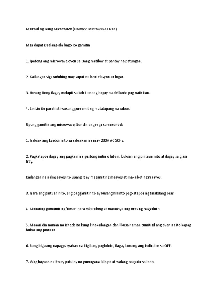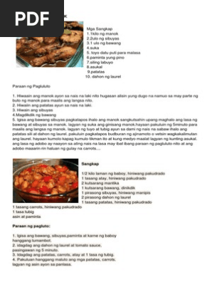 Manwal sa mga elektrikal na kagamitan na tulad ng smarth phone. SIGURADUHING MALINIS ANG MGA KAMAY. Nilalaman ng isang prosidyural na teksto tungkol sa pagluluto ng adobo.