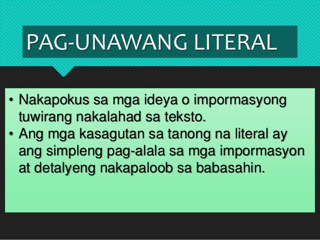 Malalim na pag-unawa sa mga akdang binabasa ay unti- unti nang bumababa ang bilang ng mga mag- aaral na nasasabing sila ay nakasasagot nang mahusay sa mga katanungang inilalahad patunay lamang ito na nangangailangan ang mga mag-aaral ng interbensyon upang mapaunlad ang kakayahan nila sa. 24112015 Ang ibig sabihin ng PAG-UNAWANG LITERAL ay tumutukoy ito sa pinakamababaw na kahulugan ng isang salita o alinmang pahayag. Maraming pagtatangka ang ginagawa sa pag-uuri ng mga kasanayan sa pag-unawa ngunit ang kay Barret 1968 na taksonomiya ni Barret.