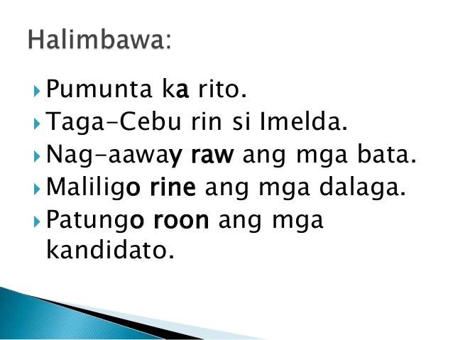 Maliligo rine ang mga dalaga. Tandaan din na kung ang salita ay nagtatapos sa ra re ri ro ru at raw ang dapat na gamitin ay daw. Ikaw raw ang napipisil ng mga hurado na kakatawan sa ating pamantasan.