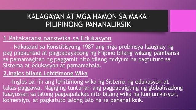 Mga halimbawa ng paksa ng pananaliksik na may oryentasyong maka pilipino. Gumamit ng sariling wika. Ang maka-Pilipinong pananaliksik ay gumagamit ng wikang Filipino ato mga katutubong wika sa Pilipinas at tumatalakay sa mga paksang mas malapit sa puso at isip ng mga mamamayan. 27022018 1Ang maka-Pilipinong pananaliksik ay gumagamit ng wikang Filipino ato mga katutubong wika sa Pilipinas at tumatalakay sa mga paksang mas malapit sa puso at sa isip ng mga mamamayan.