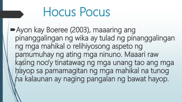 16112019 Bilang ng mga kapatid1-56-10. Teoryang Hocus Pocus Ayon kay Boeree 2003 maaaring ang pinanggalingan ng wika ay tulad ng pinanggalingan ng mga mahikal o relihiyosong aspeto ng pamumuhay ng ating mga ninuno. Isang halimbawa nito ay ang salitang weh.