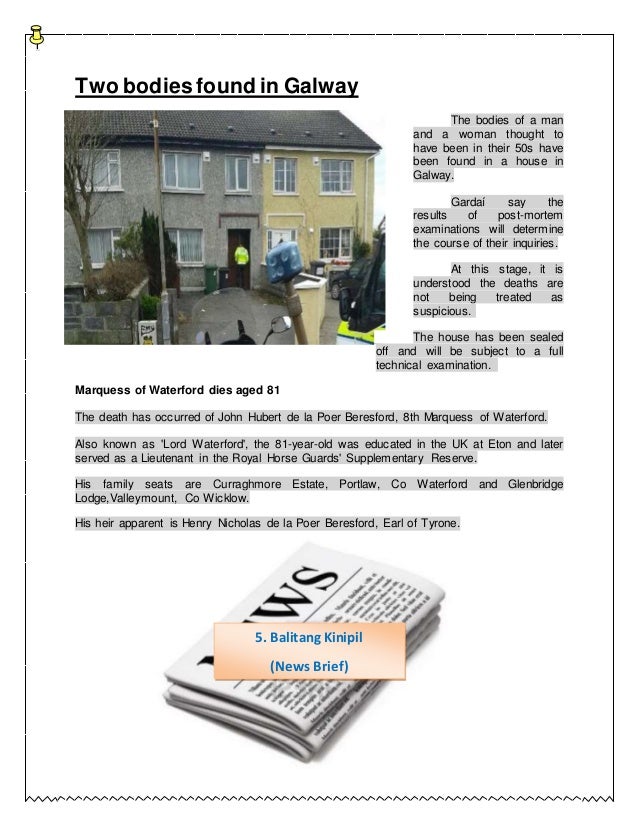 Mga halimbawa ng iba't ibang uri ng balita. 15112016 Nakararanas din ng pang-uusig ang mga simbahan sa Pilipinas ayon sa pinuno ng Catholic Bishops Conference of the Philippines CBCP. Pagtalakay ng bagong konsepto at paglalahad ng bagong kasanayan 2 ACT Pangkatang gawain Bumuo ng mga pangungusap ang bawat grupo batay sa larawan na naibigay. KONSEPTO BALITA -tumutukoy sa pa- salita o pasulat na ulat na tungkol sa mga bagay na.