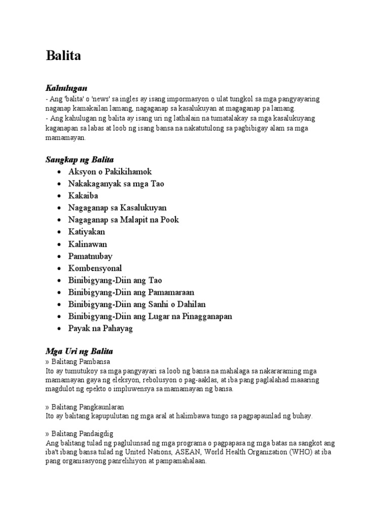 Kaya maaaring sabihing ang anumang kaganapan na balita para sa isa ay hindi balita para sa iba. Scribd es red social de lectura y publicacin ms importante del mundo. Binibigyang-diin ang tao sino sangkap ng balita.